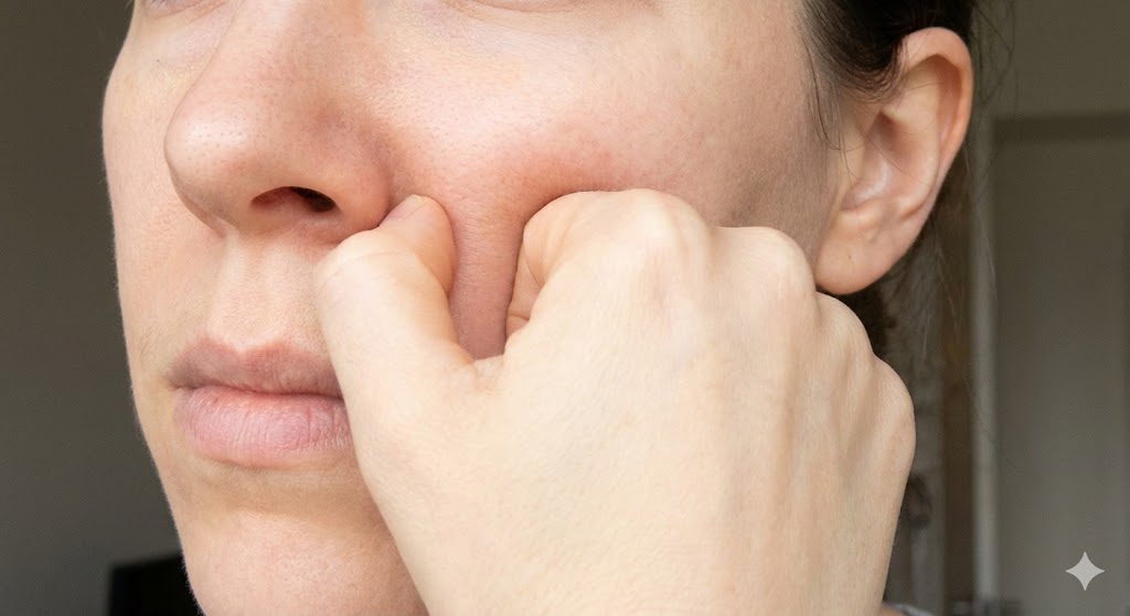2. 콧망울 옆(영향혈)에서 광대뼈 라인을 따라 귀 앞쪽까지 지그시 누르며 밀어 올립니다.